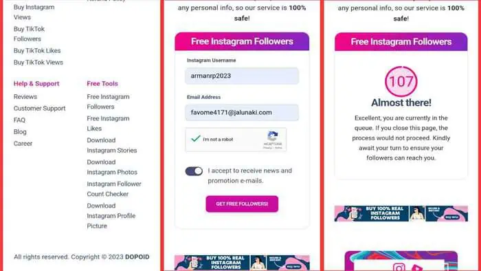 After clicking on the Get Free Followers button, enter your Instagram username and fake email, then follow the steps to complete your order.