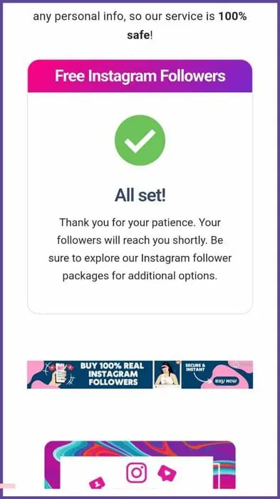Once you click Get Free Followers, a timer will appear. After the timer completes, a message with a green checkmark will confirm that your follower order has been placed.