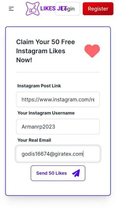 Visit the website, copy the link of your Instagram post, enter your actual username and email, and click on the option to receive likes. You can get 500 likes without any charges.